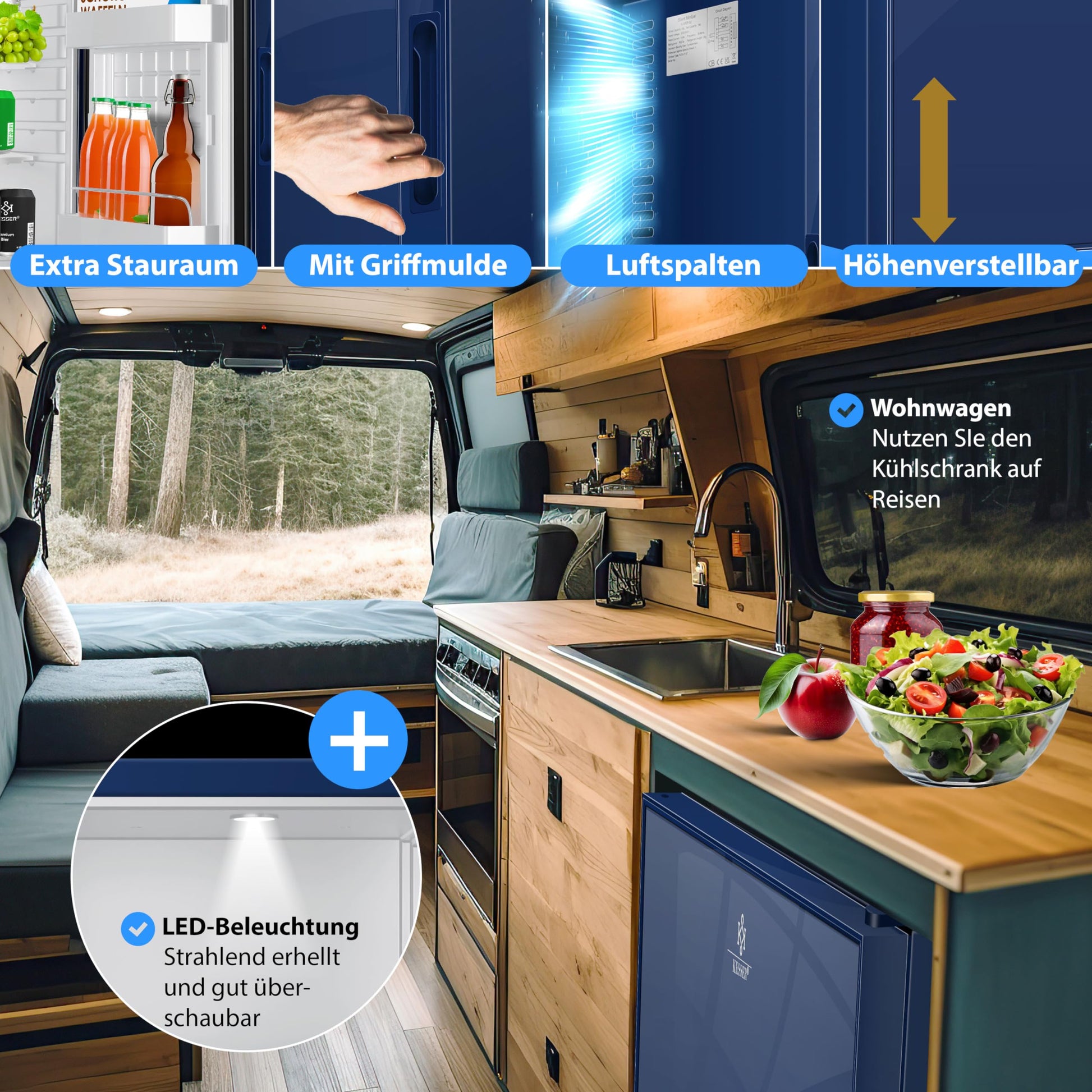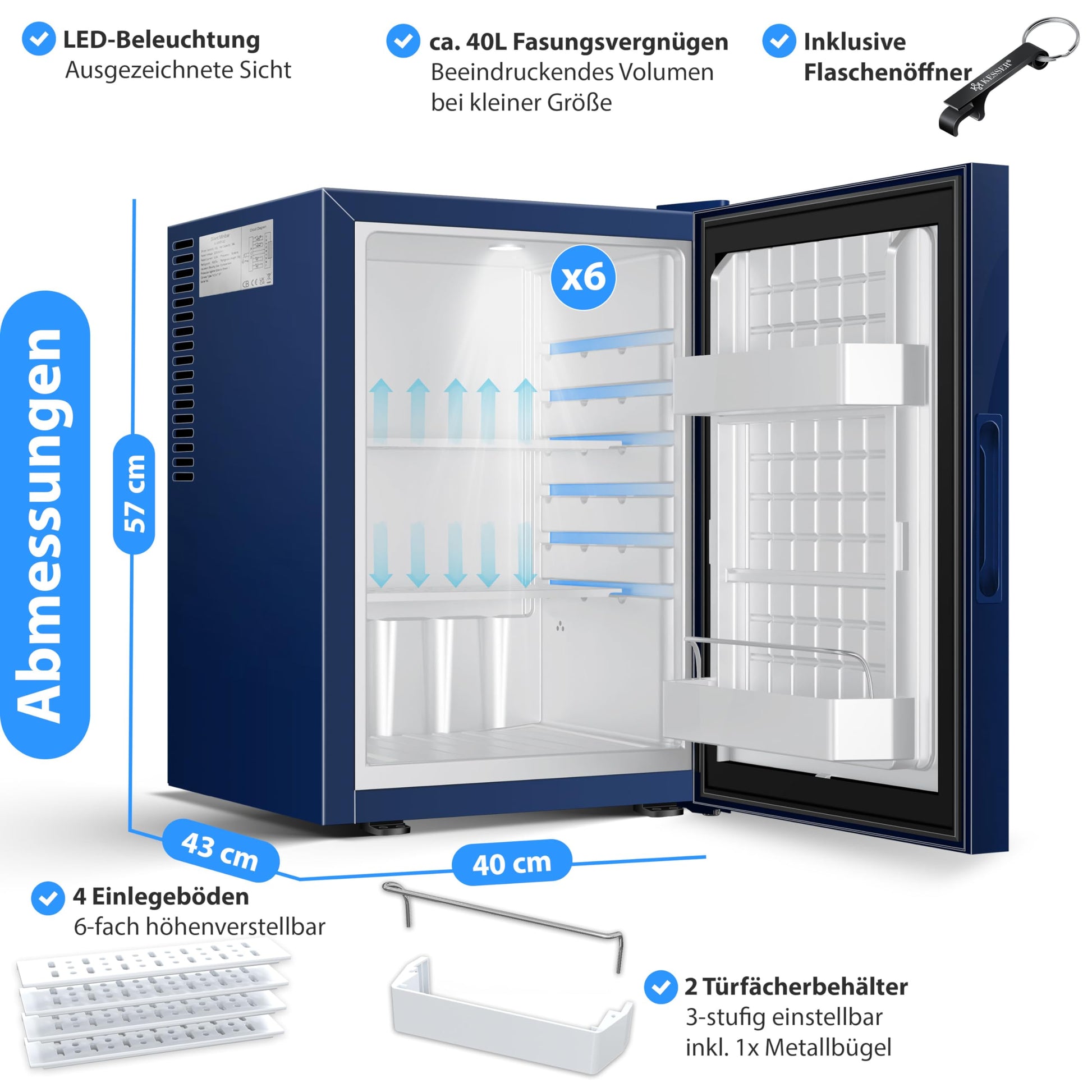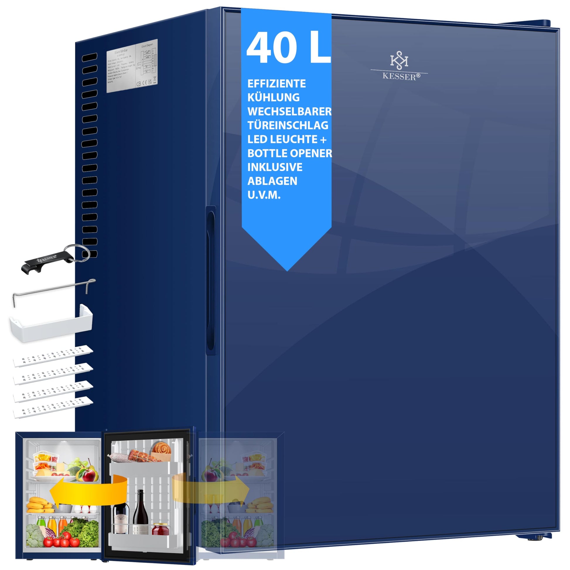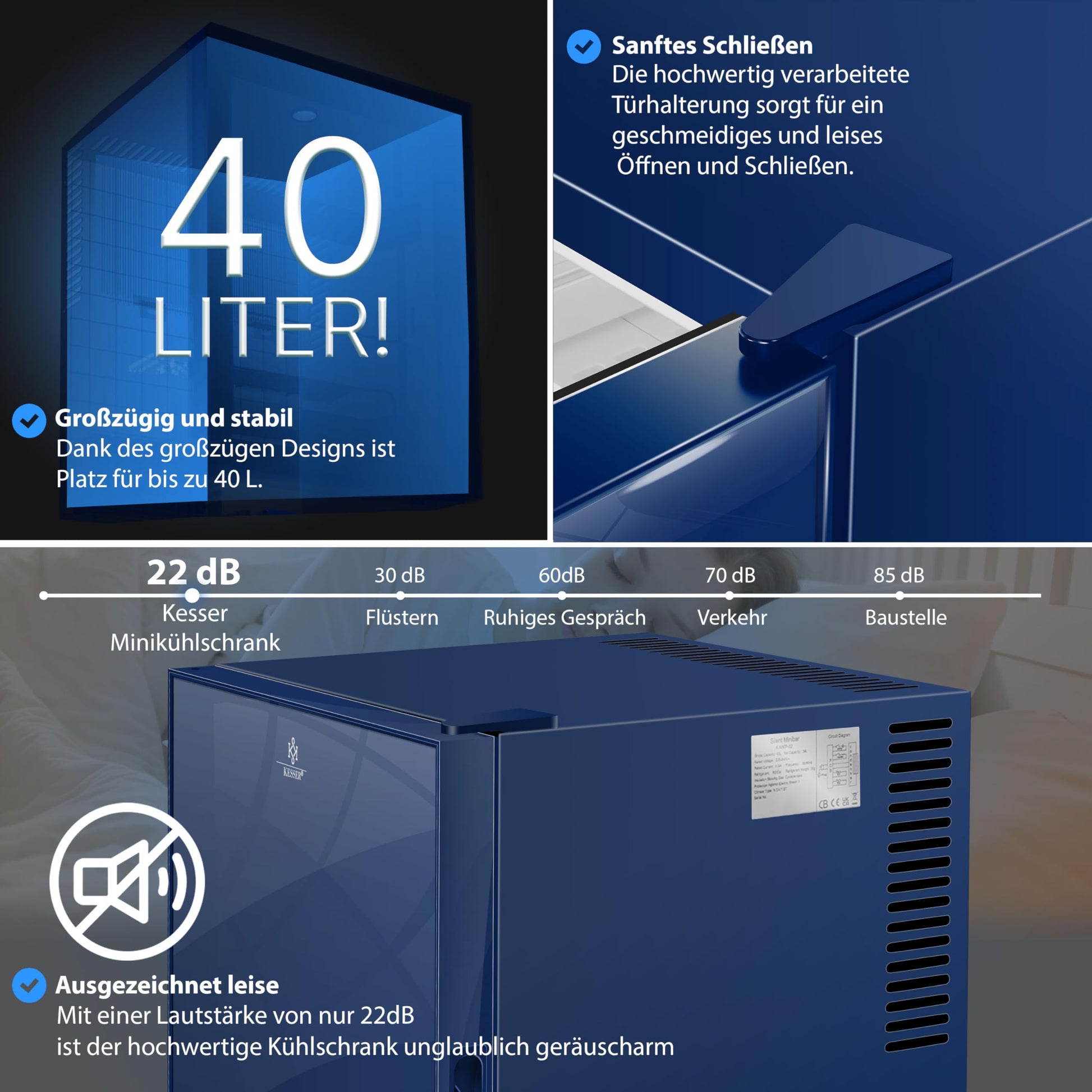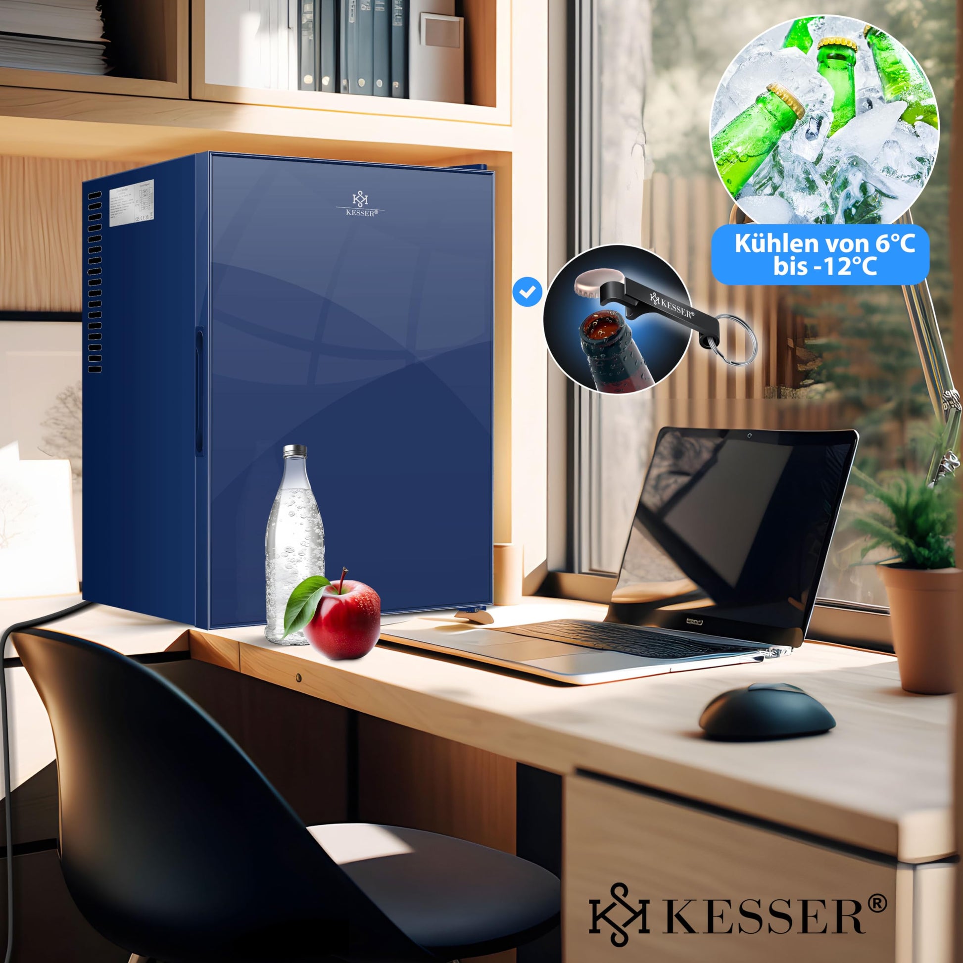 KESSER Mini Nevera 40L Azul Marino | Puerta de Cristal Reversible, Iluminación Interior, 6°-12°C, 22 dB, Altura 57 cm | Clase Energética F | Frigorífico Silencioso para Bebidas y Snacks