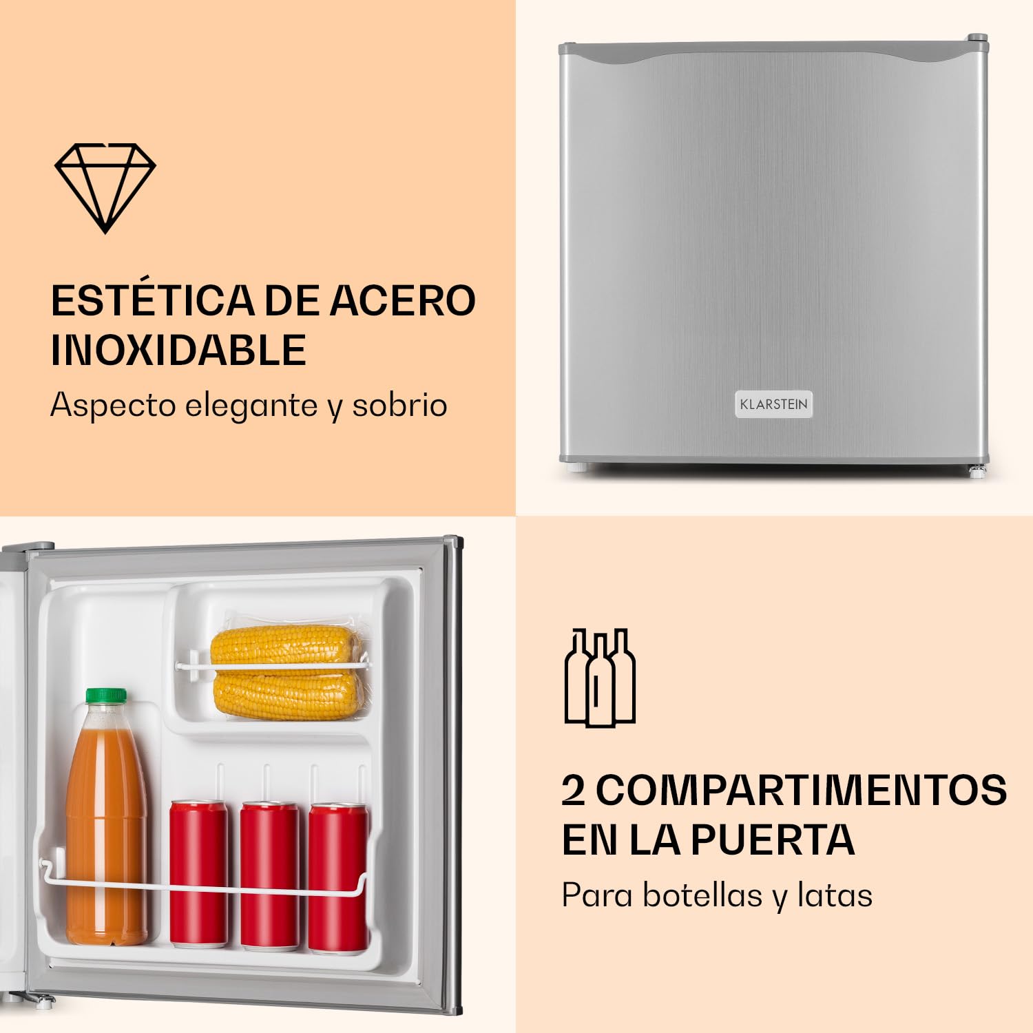 Klarstein Mini Bar 46L – Mini Nevera Silenciosa con Botellero, Estante y Compartimento de Puerta, Ajuste de Temperatura, Color Plata