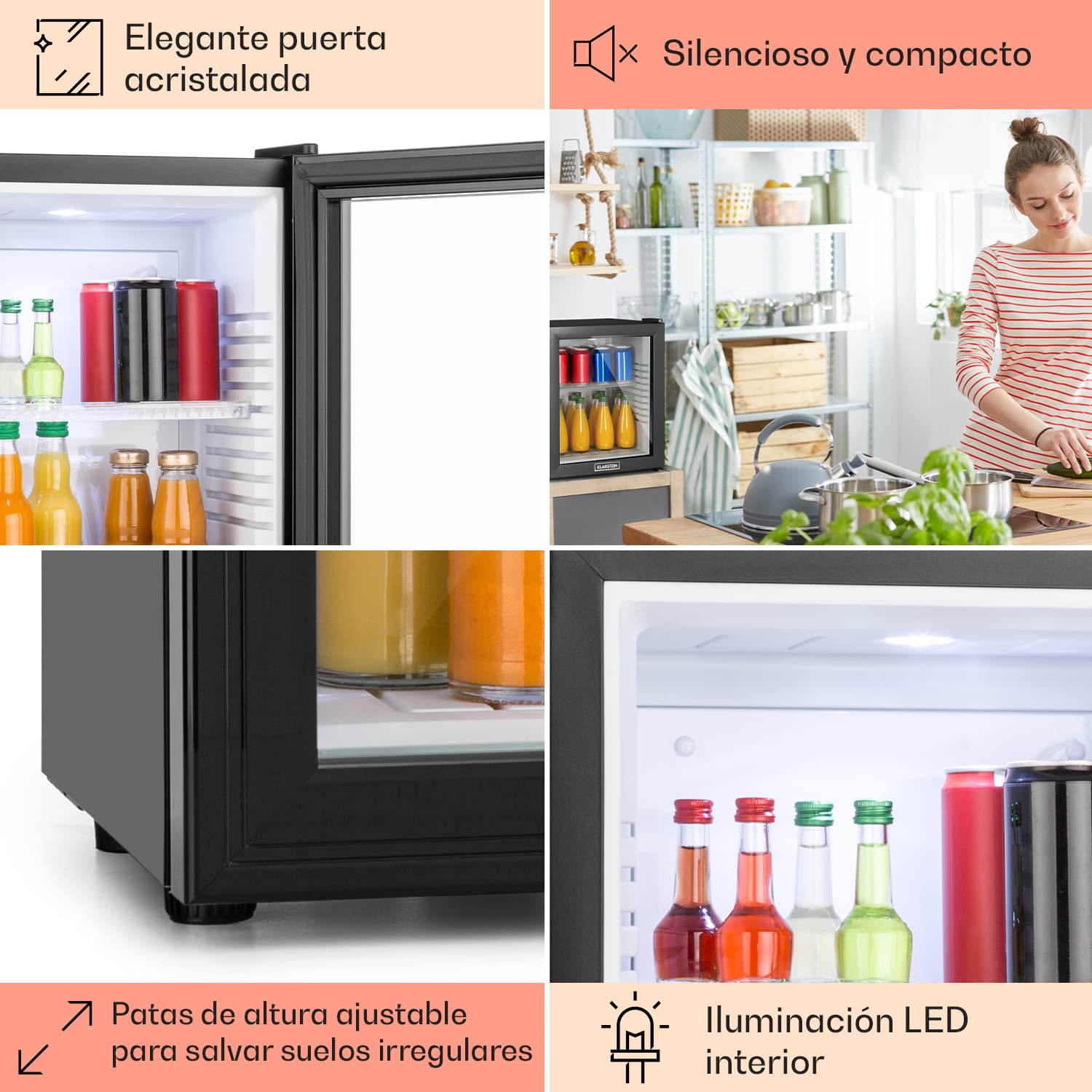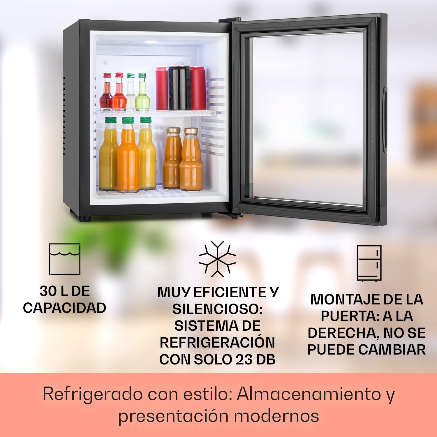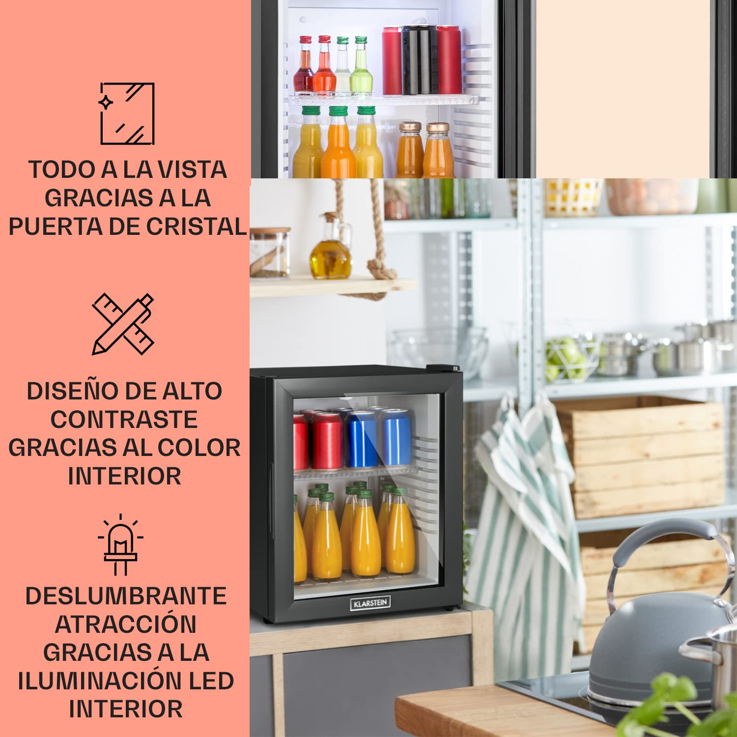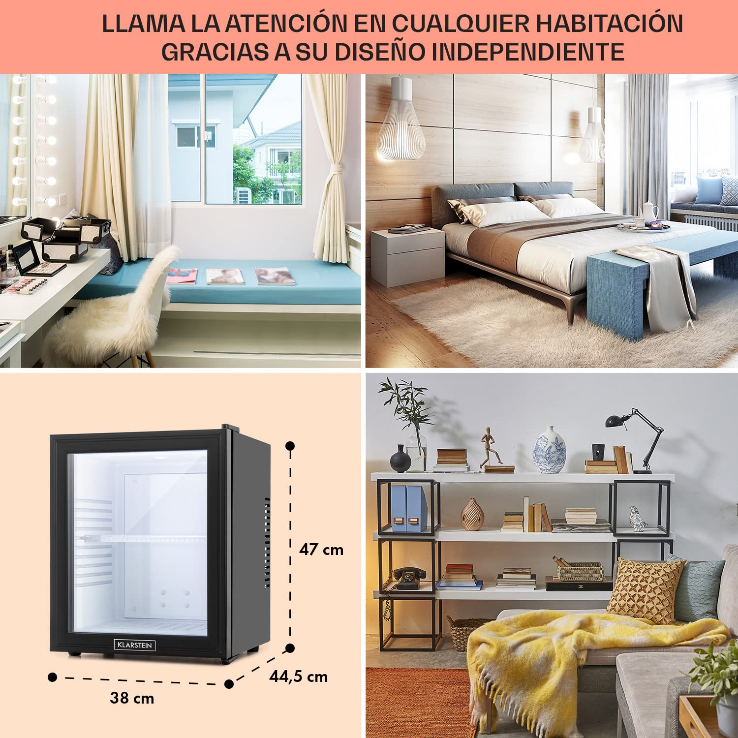 KLARSTEIN Nevera Pequeña Silenciosa, Mini Neveras para Habitación, Bajo Consumo, Puerta de Cristal, Frigoríficos Pequeños Temperatura 12 to 18 °C, Neveras Pequeñas de 30L, Minibar 1 Estante, Negro