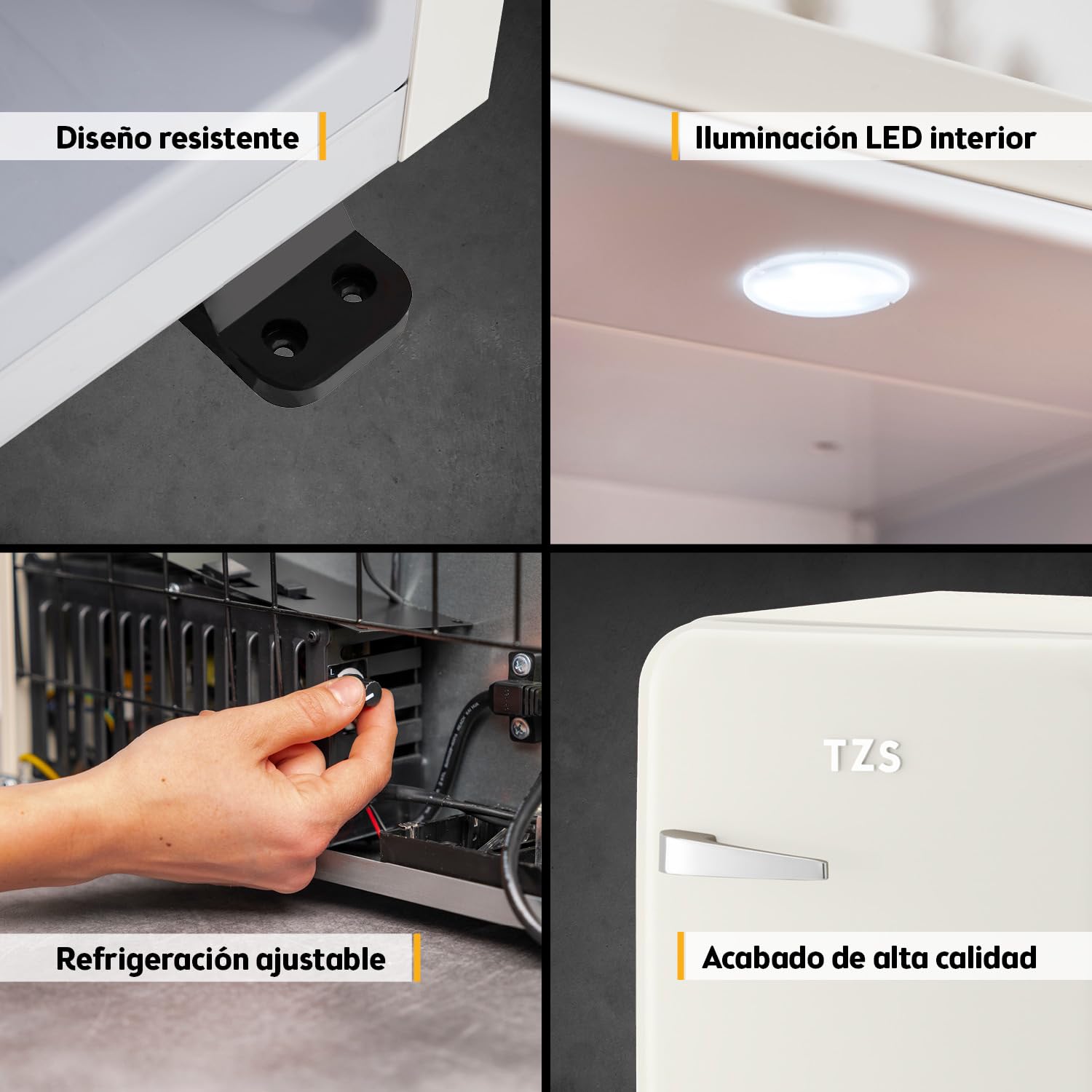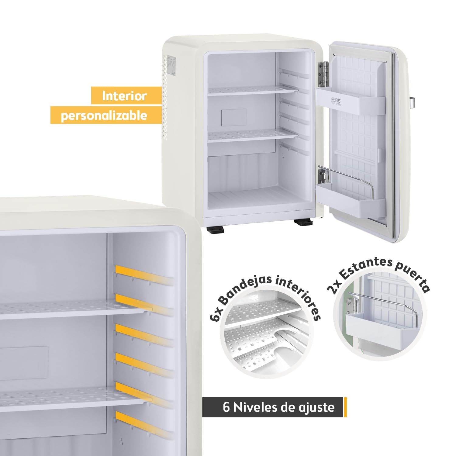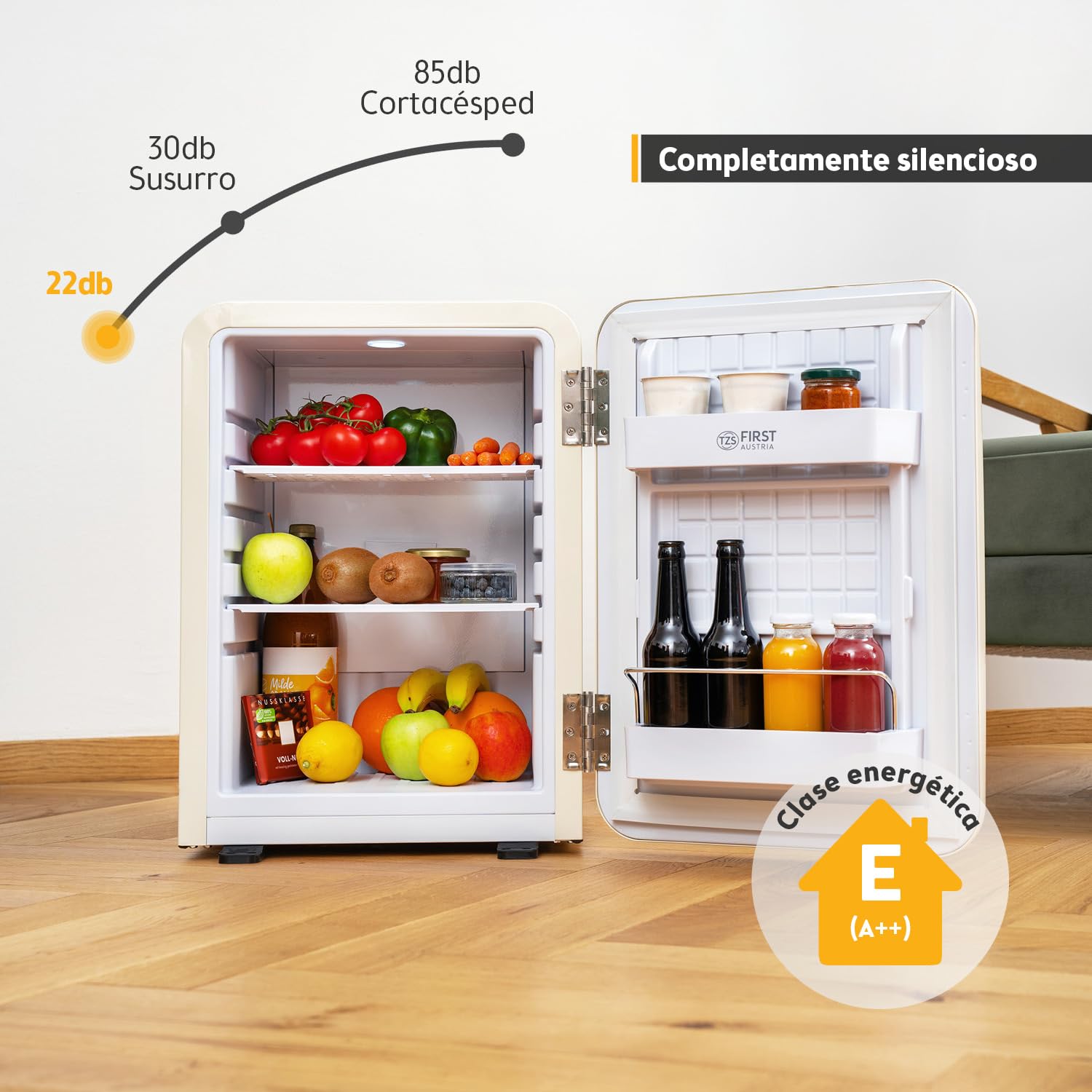 La mini nevera TZS First Austria de 40 L en color crema combina elegancia retro con máxima funcionalidad. Su sistema termoeléctrico garantiza un funcionamiento completamente silencioso, ideal para habitaciones, oficinas o espacios de descanso. Compacta pero espaciosa, ofrece una excelente organización interior con estilo vintage.